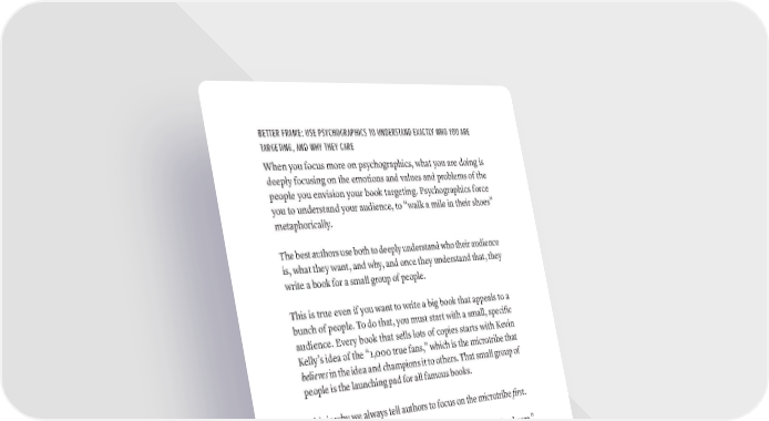 BETTER FRAME: USE PSYCHOGRAPHICS TO UNDERSTAND EXACTLY WHO YOU ARE TARGETING, AND WHY THEY CARE When you focus more on psychographics, what you are doing is deeply focusing on the emotions and values and problems of the people you envision your book targeting. Psychographics force you to understand your audience, to “walk a mile in their shoes” metaphorically. The best authors use both to deeply understand who their audience is, what they want, and why, and once they understand that, they write a book for a small group of people. This is true even if you want to write a big book that appeals to a bunch of people. To do that, you must start with a small, specific audience. Every book that sells lots of copies starts with Kevin Kelly’s idea of the “1,000 true fans,” which is the microtribe that believes in the idea and champions it to others. That small group of people is the launching pad for all famous books. This is why we always tell authors to focus on the microtribe first. There’s a famous concept in innovation called “crossing the chasm.” It’s where a product tilts into the mass market. It cannot cross the chasm unless you start with your microtribe of “innovators” and “early adopters.” The people who believe in your idea and spread it to others are all you should be concerned about at the beginning, because they are the ones who will push your idea into the mainstream. If you truly want to change the world and reach tons of people, this is how you do it. figUrE OUT yOUr AUDiENCE · 69