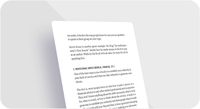 necessity. A book is the way people know for sure you are qualified to speak to their group on your topic. Kevin Kruse is another great example. His blog “An Authorpre- neur’s First $100K” details how he made money in his first year as an author. While he did $70K in book sales, he made $170K in speaking fees. 3. PROFESSIONAL SERVICE (MEDICAL, FINANCIAL, ETC.) One of the best ways to use a book is to establish your authority in your field of service and then use that authority to generate new clients. The fact is, most people have no idea how to pick a doctor or a financial advisor or any other related professional service practice. They don’t know anything about the skills necessary, what to look for, what to avoid, or how to think about the service. A book is a great way to establish your authority and show people what it would be like to work with you. Beyond that, it does a great job educating your clients on what they should expect, making your job easier. Dr. Michael Lewis has a specialized practice centered around traumatic brain injury. His book, When Brains Collide, is a great introduction to traumatic brain injury and how to treat it, so much so that his practice has grown over 30 percent in size since the book came out. Sam Marrella saw something very similar happen to his financial planning firm. After writing his book, he got a barrage of local media and speaking requests, and saw his assets under manage- ment double. This is fairly common for financial planners, as there is always a need for good financial advice and services. hOW TO MAkE MONEy WiTh yOUr BOOk · 387