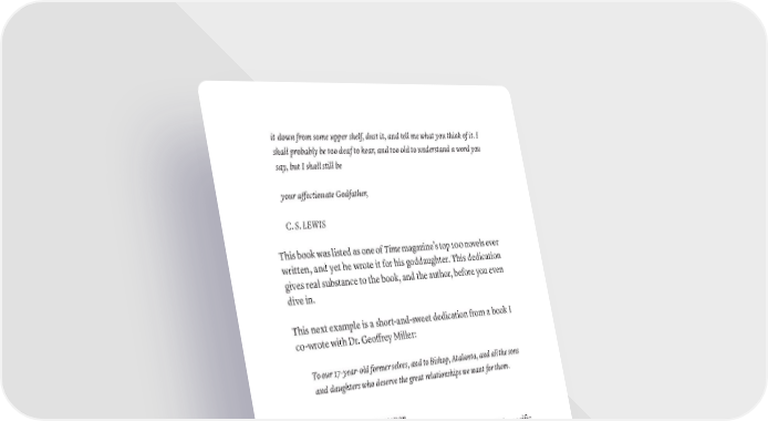it down from some upper shelf, dust it, and tell me what you think of it. I shall probably be too deaf to hear, and too old to understand a word you say, but I shall still be your affectionate Godfather, C. S. LEWIS This book was listed as one of Time magazine’s top 100 novels ever written, and yet he wrote it for his goddaughter. This dedication gives real substance to the book, and the author, before you even dive in. This next example is a short-and-sweet dedication from a book I co-wrote with Dr. Geoffrey Miller: To our 17-year-old former selves, and to Bishop, Atalanta, and all the sons and daughters who deserve the great relationships we want for them. 5. WRITE YOUR BOOK DEDICATION The number one thing to keep in mind is that there is NO specific formula for this. The dedication is one of the most personal sec- tions in the book, and it’s up to you to decide how you want to use it. What’s inside of your book is more important, and getting it out into the world is the MOST important thing. 206 · ThE SCriBE METhOD