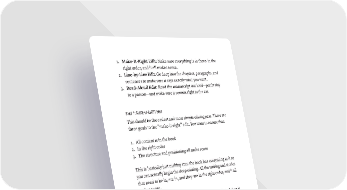 1. Make-It-Right Edit: Make sure everything is in there, in the right order, and it all makes sense. 2. Line-by-Line Edit: Go deep into the chapters, paragraphs, and sentences to make sure it says exactly what you want. 3. Read-Aloud Edit: Read the manuscript out loud—preferably to a person—and make sure it sounds right to the ear. PART 1: MAKE-IT-RIGHT EDIT This should be the easiest and most simple editing pass. There are three goals to the “make-it-right” edit. You want to ensure that: 1. All content is in the book 2. In the right order 3. The structure and positioning all make sense This is basically just making sure the book has everything in it so you can actually begin the deep editing. All the writing and stories that need to be in, are in, and they are in the right order, and it all makes sense. That’s pretty much it. Don’t make this more complicated than it needs to be. PART 2: LINE-BY-LINE EDIT This is the framework we use for our line-by-line editing. It’s simple to understand, but powerful if you do it right. It gives you the exact questions to ask yourself at each level of editing: As you read every chapter, ask yourself these six questions: 1. What point am I making? 2. Is it necessary? 3. Is it as short as possible? 4. Is it as simple as possible? hOW TO EDiT yOUr BOOk · 165