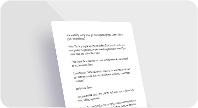 and visibility in my field, get more speaking gigs, and be able to grow my business.” Note: You’re going to specifically define these benefits as the very next part of the process, but put something down now, even if you come back and refine them later. Then speak these benefits out loud, making sure to frame yourself as excited about them. Literally say, “YOU should be excited, because this book will get YOU increased authority, additional speaking, and a bigger business.” Do it three times. And you MUST say it OUT LOUD. And make sure to phrase it as you, talking to yourself. I know, this sounds hokey, but saying it out loud has a very different impact on you than just thinking it. Without going too deep into the psychological explanation, saying it out loud makes it more real to your brain. [If you want to know why saying this out loud makes such a dif- ference, Google “inner speech of behavioral regulation” or “Von Restorff effect.” Warning: these will take you down a serious rabbit hole.] STEP 5: ASK YOURSELF, “WHO’S HELPED BY YOUR BOOK, AND WHAT DO THEY GET?” Did you notice a trend with the fears you mentioned? What did they all have in common? It’s actually pretty simple: All fear is selfish. 46 · ThE SCriBE METhOD