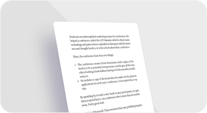 Books are an underexploited marketing avenue for conferences. We helped a conference called the LDV Summit, which is about vision technology and pairs venture capitalists in that space with the inven- tors and thought leaders, to write a book about their conference. Then, the conference host does two things: 1. The conference owner (Evan Nisselsen) sends copies of the book to LPs or potential entrepreneurs, and he gets all the ben- efits of writing a book without having to be the one who actually writes it. 2. He includes a copy of the book when he mails out the physical applications for each year’s conference. It has tripled his re-up rate. By spending $5 to mail a nice book to past participants, he gets them to spend $500+ on a conference that is more than six months away. Pretty good deal. TED does this as well. They even have their own publishing imprint. 18. ATTRACT HIGH-NET-WORTH CLIENTS If you are in the business of selling to high-net-worth people, you know how hard they can be to attract and sell to. Having a great book makes that job much easier. An example is Alex Andrawes, a high-end wine broker who helps people invest in fine wines. He was successful before writing a book, but after he published his book on investing in fine wines, he dou- bled his inbound leads and tripled his highest net worth clients—in only a year. Nik Tarascio owns an airplane brokerage business. There are very few people who can afford to buy an airplane, and he used his book to help him both attract and close numerous buyers. 396 · ThE SCriBE METhOD