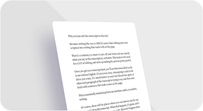 Why not just edit the transcription directly? Because writing this way is MUCH easier than editing your tran- scription into writing that reads well on the page. There’s a tendency to want to turn off your brain and use exactly what you say in the transcription, verbatim. This leads to the need for a LOT of editing, and ends up making the process pretty painful. Once you get your transcript back, you’ll see that transcribed audio is not written English. It’s not even close. Attempting to edit it will drive you crazy. It’s much better to read and absorb the spirit of what each paragraph of the transcript is trying to say, and then start fresh with sentences that make sense on the page. This is essentially translating from one medium, audio, to another, writing. Of course, there will be places where you can almost exactly use your words from the transcript. When that happens, it’s great, and it makes your job easier. But for most people, this won’t happen often. Note: In some cases, this may include adding content that isn’t in the transcript. Some ideas require some expansion to connect properly. You will need to add transitions or connections that aren’t part of the transcript. This is totally fine, of course. They’re your ideas, after all. If this gets hard, and it will, just keep going. This is where it’s easy to give up. You’ll regret it if you do. Again, don’t worry about being perfect, as you’re going to come back and do an edit later. This is just getting the first draft done. You’re getting something down that you can come back to and per- fect later. 158 · ThE SCriBE METhOD