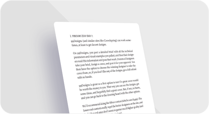 2. 99DESIGNS ($300-$600+): 99Designs (and similar sites like Crowdspring) can work some- times, at least to get decent designs. On 99Designs, you post a detailed brief with all the technical parameters and visual examples you pulled, and then their design- ers read this information and post their work. Dozens of designers take your brief, design a cover, and post it for your approval. You then have the option to choose the winning designer to take the cover from, or, if you don’t like any of the designs, get a full refund with no hassle. 99Designs is great as a first option to test if a great cover would be worth the money to you. That way you can see the designs, get some ideas, and hopefully find a great cover. But, if not, no harm, and you can go back to the drawing board with the other options. We’d recommend doing the Silver contest (which costs $499). The lower end contests really repel the better designers on the site, and the higher end ones don’t seem to garner much higher quality (and actually tend to get fewer submissions). 3. UPWORK ($50-$500+): The next step up the quality ladder would be a freelance network like Upwork. The overall quality on Upwork is not high, but there are some quality designers hidden on there. Expect to take your time to find the right person on one of these sites, but you will be able to find them. Job ads typically get dozens if not hundreds of responses, and designers typically link a portfolio of past work. Screen out anyone with more than a few negative reviews, and then focus 100 percent of your screening time on judging their portfolios. Do a side by side comparison of the covers you liked when you did your research on Amazon. Do they appear to be of similar quality? If you can’t tell, ask a friend who understands the basics of design. hOW TO gET A grEAT BOOk COvEr · 285
