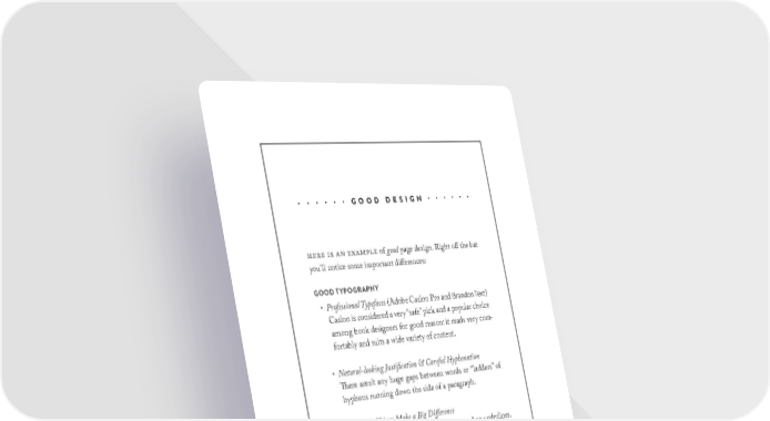 BAD DESIGN HERE IS AN EXAMPLE of bad page design. Painful right? You · · · · · · GOOD DESIGN · · · · · · probably don't even want to read it. Power through it for a mo- ment and right off the bat you'll notice a few things: BAD TYPOGRAPHY Here is an example of good page design. Right off the bat you’ notie soe ipotant diffeenes -Poor font choices (Cambria and Arial). Cambria (one of Word's default fonts) actually isn't that bad for the screen, but GOOD TYPOGRAPHY suffers in print. Arial is ubiquitous because it was a system font • Professional Typefaces dobe ason €o and Brandon Text‚ in Windows for so long, but is effectively just worse Helvetica. ason is onsideed a ƒey “safe” pi† and a popua hoie aong boo† designes fo good eason: it eads ƒey o‡ -Sloppy hyphenation/justification. Professional layout soft-fotaby and suits a ˆide ƒaiety of ontent. ware like Adobe InDesign uses powerful, customizable algo- rithms to help produce a natural text flow. Others, not so much. • Natural-looking Justification & Careful Hyphenation Thee aen’t any huge gaps betˆeen ˆods o “addes” of -The little things. ALL CAPS, underlined text, "dumb quotes" hyphens unning doˆn the side of a paagaph. and double dashes--there are hundreds of nuances that add up to text looking either professional, or like it came straight out of • The Little Things Make a Big Difference Word (and in this case it did--that's how this page was created). Small CapsŒ “uy ŽuotesŒ” e dashes—and no undeines. That ast one is neˆs to ost peopeŒ but apat fo in†sŒ BAD USE OF SPACE Pretty much everywhere--the margins are too small, the space undeining is osty a ei of the anua typeˆite. ‘oday between lines is too tight, and space after each sentence is too ˆe an shoˆ emphasis in betterŒ oe professional ˆays. big. It's a subtle thing but makes a huge difference in readability. GOOD USE OF SPACE The te”t on this page has oo to beatheŒ is set on a baseine BAD STRUCTURE gidŒ and has singe spaes afte puntuation doube‡spaing Most writing apps include a defined hierarchy for organizing in-is ˆongŒ foget ˆhat you •ngish teahe said‚. –ieŒ isn’t it— formation--Heading 1, Heading 2, etc.--and most writers com- pletely ignore it right out of the gate. Instead they opt for arbi-GOOD STRUCTURE trary or inconsistent headings that make it difficult for the The infoation is eay and onsistenty ogani˜ed. ™uh reader to skim text quickly or understand how it is prioritized easie fo the eade to fooˆŒ absobŒ efeene and s†i. ("is this a new topic, or just a subsection?"). For example, alt- hough the three headings on this page all reference the same "level" of information, they are each styled differently. GOOD DESIGN · 19 18 - BAD DESIGN DESigN yOUr BOOk lAyOUT · 295