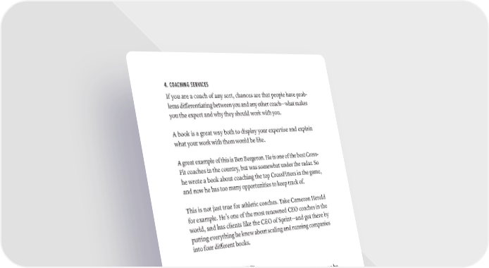 4. COACHING SERVICES If you are a coach of any sort, chances are that people have prob- lems differentiating between you and any other coach—what makes you the expert and why they should work with you. A book is a great way both to display your expertise and explain what your work with them would be like. A great example of this is Ben Bergeron. He is one of the best Cross- Fit coaches in the country, but was somewhat under the radar. So he wrote a book about coaching the top CrossFitters in the game, and now he has too many opportunities to keep track of. This is not just true for athletic coaches. Take Cameron Herold for example. He’s one of the most renowned CEO coaches in the world, and has clients like the CEO of Sprint—and got there by putting everything he knew about scaling and running companies into four different books. 5. CLIENTS FOR YOUR AGENCY Every agency owner knows what a pain client acquisition can be. A book doesn’t magically solve this problem, but it does make it much easier to both find and close new clients. Deb Gabor had this problem with her branding agency and used a book to not only solve that problem, but to catapult her agency to the next level. She now works with companies like Dell, NBC, and Microsoft, and she credits her book as the reason her agency stood out from other agencies. Melissa Gonzalez did the same thing for her design and pop-up retail agency. She put most of what she knew about pop-up retail in her book, and it doubled her business in two years. Plus, it was the reason she got hired by many major retailers: Macy’s, Chanel, and Marc Jacobs have all worked with Melissa since her book came out. 388 · ThE SCriBE METhOD