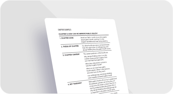 CHAPTER EXAMPLES: CHAPTER 3: HOW CAN WE IMPROVE PUBLIC HEALTH? 1. CHAPTER HOOK American Public Health Association quote about public health, and how it is the biggest unaddressed issue facing America. 2. THESIS OF CHAPTER No other healthcare space can benefit more from the application of anthropology and design thinking than the public health sector. 3. CHAPTER CONTENT The current problems within healthcare Why design thinking alone is not the solution (every patient requires their own individualized approach) What does educational assistance look like in public health? What we can learn from public health experts (What is their process, and what tools do they use?) How anthropology and design thinking come together to benefit public health 4. KEY TAKEAWAY While public health officials try to understand the problems patients are facing, they will always miss the mark as long as they fail to start by understanding the patient—this is why design thinking and anthropology are so important in the public health space. 5. CALLBACK TO HOOK American Public Health Association quote about how public health can be addressed 6. SEGUE TO NEXT The public health space is complicated. CHAPTER Understanding this, and that the space is further complicated by cultural barriers, enables them to work harder to find solutions that fill these gaps. CrEATE yOUr BOOk OUTliNE · 103