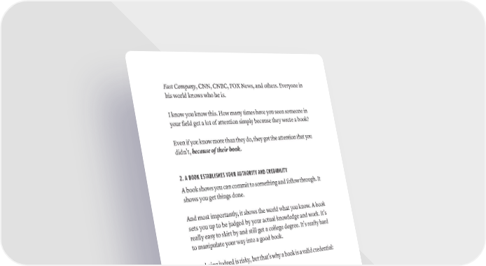 Fast Company, CNN, CNBC, FOX News, and others. Everyone in his world knows who he is. I know you know this. How many times have you seen someone in your field get a lot of attention simply because they wrote a book? Even if you know more than they do, they got the attention that you didn’t, because of their book. 2. A BOOK ESTABLISHES YOUR AUTHORITY AND CREDIBILITY A book shows you can commit to something and follow through. It shows you get things done. And most importantly, it shows the world what you know. A book sets you up to be judged by your actual knowledge and work. It’s really easy to skirt by and still get a college degree. It’s really hard to manipulate your way into a good book. Yes, being judged is risky, but that’s why a book is a valid credential: it is a risk. By writing a book, you are in a place that most people are unwilling to go—being judged—and it usually requires a lot of work to get there. It requires you to prove you actually know something. This is exactly what Bob Glazer did with his book. He wrote about a hard subject that has a lot of baggage (affiliate marketing) but wrote in a very open and vulnerable way, and shared his knowledge about his industry. He got tons of credibility and authority from both the media and clients because of how good his book was, how much of his “secrets” he shared, and how honest it was. Same with John Ruhlin. He is a gifting expert and shared all of his best secrets in his book. As a result, the book not only took off, hOW WriTiNg A BOOk CAN BUilD yOUr BrAND · 377