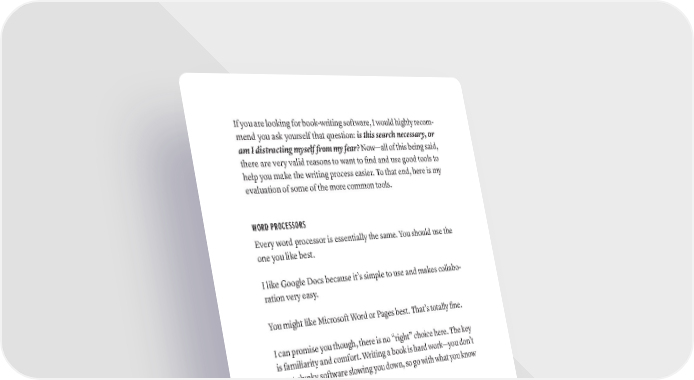If you are looking for book-writing software, I would highly recom- mend you ask yourself that question: is this search necessary, or am I distracting myself from my fear? Now—all of this being said, there are very valid reasons to want to find and use good tools to help you make the writing process easier. To that end, here is my evaluation of some of the more common tools. WORD PROCESSORS Every word processor is essentially the same. You should use the one you like best. I like Google Docs because it’s simple to use and makes collabo- ration very easy. You might like Microsoft Word or Pages best. That’s totally fine. I can promise you though, there is no “right” choice here. The key is familiarity and comfort. Writing a book is hard work—you don’t want clunky software slowing you down, so go with what you know and with what feels right to you. GRAMMARLY Every word processor will check your spelling and grammar for basic mistakes. What spell check won’t help you do is make your writing short, simple, and direct. If you would like help with that, check out Grammarly.com, a free writing assistant that integrates with Google Docs and Microsoft Word. If you have a Mac, you can download the desktop app, and it will integrate to most everything you use to write. There are paid plans available, but the free version is enough for writing a book. ThE ONly SOfTWArE yOU NEED TO WriTE A BOOk iS AlrEADy ON yOUr COMPUTEr · 439