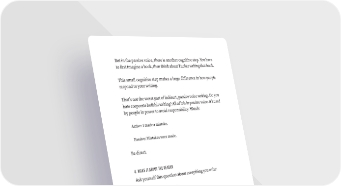 But in the passive voice, there is another cognitive step. You have to first imagine a book, then think about Tucker writing that book. This small cognitive step makes a huge difference in how people respond to your writing. That’s not the worst part of indirect, passive voice writing. Do you hate corporate bullshit writing? All of it is in passive voice. It’s used by people in power to avoid responsibility. Watch: Active: I made a mistake. Passive: Mistakes were made. Be direct. 4. MAKE IT ABOUT THE READER Ask yourself this question about everything you write: “Why does the reader care?” This is the hardest principle to apply, because when you do this, you realize that most of your writing is for yourself—not the reader. You see your writing for what it probably is: selfish, indulgent, and grandiose. If that happens, don’t get down on yourself. That is common. Only every author ever has had that problem. All you have to do is stop writing about things the reader doesn’t care about and focus on what they do. CONCLUSION Short, simple, direct, about the reader. 136 · ThE SCriBE METhOD