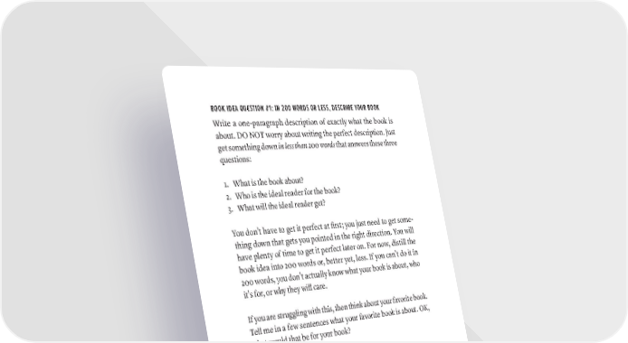 BOOK IDEA QUESTION #1: IN 200 WORDS OR LESS, DESCRIBE YOUR BOOK Write a one-paragraph description of exactly what the book is about. DO NOT worry about writing the perfect description. Just get something down in less than 200 words that answers these three questions: 1. What is the book about? 2. Who is the ideal reader for the book? 3. What will the ideal reader get? You don’t have to get it perfect at first; you just need to get some- thing down that gets you pointed in the right direction. You will have plenty of time to get it perfect later on. For now, distill the book idea into 200 words or, better yet, less. If you can’t do it in 200 words, you don’t actually know what your book is about, who it’s for, or why they will care. If you are struggling with this, then think about your favorite book. Tell me in a few sentences what your favorite book is about. OK, what would that be for your book? EXAMPLES OF WELL-WRITTEN BOOK IDEAS This book will be an informative, easy-to-digest guide to hand safety in construction and manufacturing workplaces. The author will share what companies can do to educate their teams on hand safety and how to reduce hand injuries amongst their employees outside of just purchasing gloves. He will explain the methodology and safety tips needed to prevent hand injuries before they happen, and what to do if they do happen to prevent them from coming up again. He will include case studies, helpful tips, and practical applications that safety manag- ers can use to prevent the majority of hand injuries in these companies, which is a huge risk each day. *** 86 · ThE SCriBE METhOD