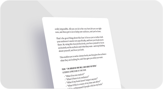 erally impossible. All you can do is the very best job you can right now, and then put it out to help your audience, and you’re done. That’s the good thing about this fear: it forces you to define both your audience’s needs very specifically, and how your book meets them. By using this fear productively, you force yourself to focus exclusively on the audience and what they want—and stop thinking about yourself, and how you look. This enables you to write a better book, one that gives the audience what they are looking for, and thus gets you what you want. FEAR: “I’M AFRAID NO ONE WILL CARE ABOUT MY BOOK.” ALTERNATE EXPRESSIONS OF THIS FEAR: • “What if no one reads it?” • “What if there is no audience?” • “What if my book doesn’t impact anyone?” • “What if this is a waste of my time and effort?” • “I’ll be embarrassed if people criticize my book.” HOW THIS FEAR WILL IMPACT YOUR BOOK This is a pretty simple fear, and it generally comes up in people who are trying to find a way to avoid other deeper fears (like the “looking stupid” fear, covered below). Usually, this fear manifests by an author convincing themselves that no one will care about their book. Paradoxically, this is almost always suffered by the authors who have the books that are most impactful on others (the authors who should worry about this, almost never do—such is life, right?). EXAMPLE OF AN AUTHOR WITH THIS FEAR Dr. Douglas Brackmann grew up with ADHD and was told his 32 · ThE SCriBE METhOD