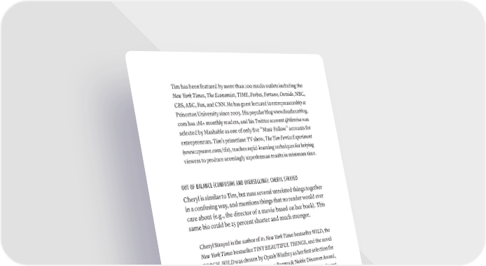 Tim has been featured by more than 100 media outlets including the New York Times, The Economist, TIME, Forbes, Fortune, Outside, NBC, CBS, ABC, Fox, and CNN. He has guest lectured in entrepreneurship at Princeton University since 2003. His popular blog www.fourhourblog. com has 1M+ monthly readers, and his Twitter account @tferriss was selected by Mashable as one of only five “Must-Follow” accounts for entrepreneurs. Tim’s primetime TV show, The Tim Ferriss Experiment (www.upwave.com/tfx), teaches rapid-learning techniques for helping viewers to produce seemingly superhuman results in minimum time. OUT OF BALANCE (CONFUSING AND OVERSELLING): CHERYL STRAYED Cheryl is similar to Tim, but runs several unrelated things together in a confusing way, and mentions things that no reader would ever care about (e.g., the director of a movie based on her book). This same bio could be 25 percent shorter and much stronger. Cheryl Strayed is the author of #1 New York Times bestseller WILD, the New York Times bestseller TINY BEAUTIFUL THINGS, and the novel TORCH. WILD was chosen by Oprah Winfrey as her first selection for Oprah’s Book Club 2.0. WILD won a Barnes & Noble Discover Award, an Indie Choice Award, an Oregon Book Award, a Pacific Northwest Booksellers Award, and a Midwest Booksellers Choice Award among others. The movie adaptation of WILD will be released by Fox Search- light in December 2014. The film is directed by Jean-Marc Vallée and stars Reese Witherspoon, with a screenplay by Nick Hornby. Strayed’s writing has appeared in THE BEST AMERICAN ESSAYS, the New York Times Magazine, the Washington Post Magazine, Vogue, Salon, The Mis- souri Review, The Sun, Tin House, The Rumpus—where she wrote the popular “Dear Sugar” advice column—and elsewhere. Strayed was the guest editor of BEST AMERICAN ESSAYS 2013 and has contributed to many anthologies. Her books have been translated into more than thirty languages around the world. She holds an MFA in fiction writing from Syracuse University and a bachelor’s degree from the University of Minnesota. She lives in Portland, Oregon with her husband and their two children. 262 · ThE SCriBE METhOD