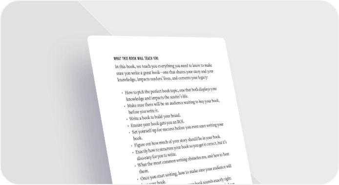 WHAT THIS BOOK WILL TEACH YOU In this book, we teach you everything you need to know to make sure you write a great book—one that shares your story and your knowledge, impacts readers’ lives, and cements your legacy: • How to pick the perfect book topic, one that both displays your knowledge and impacts the reader’s life. • Make sure there will be an audience waiting to buy your book, before you write it. • Write a book to build your brand. • Ensure your book gets you an ROI. • Set yourself up for success before you even start writing your book. • Figure out how much of your story should be in your book. • Exactly how to structure your book so you get it correct, but it’s also easy for you to write. • What the most common writing obstacles are, and how to beat them. • Once you start writing, how to make sure your audience will love your book. • Editing techniques to ensure your book sounds exactly right. • Create the motivation and inspiration, on command, to sit down and write every day. • Find the perfect book title. • Price your book to maximize both sales and impact. • Exactly who to use to help publish your book. • The key to writing book marketing copy that sells. • Getting to an amazing book cover. • And of course, the most important thing you can do to make your book a success, that most authors get wrong. WHAT THIS BOOK WILL NOT TEACH YOU There are a lot of books about how to write and publish a book, and to be honest, most of them aren’t good. This by itself is no big deal; the problem is that those books only sell because they make Why WriTE A BOOk? · 15