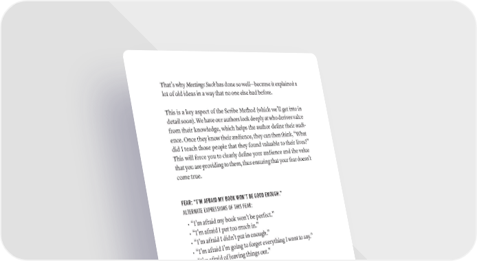 That’s why Meetings Suck has done so well—because it explained a lot of old ideas in a way that no one else had before. This is a key aspect of the Scribe Method (which we’ll get into in detail soon). We have our authors look deeply at who derives value from their knowledge, which helps the author define their audi- ence. Once they know their audience, they can then think, “What did I teach those people that they found valuable to their lives?” This will force you to clearly define your audience and the value that you are providing to them, thus ensuring that your fear doesn’t come true. FEAR: “I’M AFRAID MY BOOK WON’T BE GOOD ENOUGH.” ALTERNATE EXPRESSIONS OF THIS FEAR: • “I’m afraid my book won’t be perfect.” • “I’m afraid I put too much in.” • “I’m afraid I didn’t put in enough.” • “I’m afraid I’m going to forget everything I want to say.” • “I’m afraid of leaving things out.” HOW THIS FEAR WILL IMPACT YOUR BOOK This fear is almost always perfectionism. How is perfectionism related to fear? As the author dives into the book, they become obsessed with every detail. They fret over every word, every punctuation mark, and every phrasing. Books can get stuck here in various ways: 1. The author will try to put everything they know into the book, and this causes the book to bloat and become unmanageable. 2. The author won’t stick to a subject and will jump around to dif- ferent ideas. 30 · ThE SCriBE METhOD