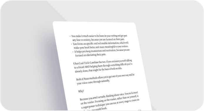 • You make it much easier to be brave in your writing and get past any fear or anxiety, because you are focused on their pain. • You focus on specific and actionable information, which will make your book better and more meaningful to your readers. • It helps you keep momentum and motivation, because you are focused on alleviating their pain. Uber Cool Trick: Combine the two. If you envision yourself talking to a friend AND helping them through something difficult you’ve already done, that might be the best of both worlds. Both of these methods allow you to get out of your own way and let your voice come through naturally. Why? Because you aren’t actually thinking about voice. You are focused on the reader. Focusing on the reader, rather than on yourself, is a superpower technique you can use at every stage to create an effective, successful book. Don’t worry about being a writer, just help people, and your voice will take care of itself. HOW DO YOU MAINTAIN ENERGY? Most authors who ask about “energy” are really asking about some- thing else. This is generally fear or anxiety taking another form. Go look at the fear chapter for reminders on how to deal with that. That being said, the most important aspect of energy is maintaining a baseline of self-care, and then having a schedule and sticking to it. If you do those two things, you’ll generate and protect most of your energy levels. 144 · ThE SCriBE METhOD