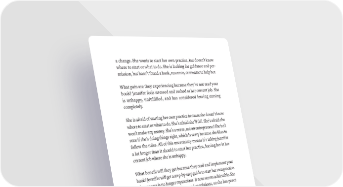 a change. She wants to start her own practice, but doesn’t know where to start or what to do. She is looking for guidance and per- mission, but hasn’t found a book, resource, or mentor to help her. What pain are they experiencing because they’ve not read your book? Jennifer feels stressed and rushed at her current job. She is unhappy, unfulfilled, and has considered leaving nursing completely. She is afraid of starting her own practice because she doesn’t know where to start or what to do. She’s afraid she’ll fail. She’s afraid she won’t make any money. She’s a nurse, not an entrepreneur! She isn’t sure if she’s doing things right, which is scary because she likes to follow the rules. All of this uncertainty means it’s taking Jennifer a lot longer than it should to start her practice, leaving her in her current job where she is unhappy. What benefit will they get because they read and implement your book? Jennifer will get a step-by-step guide to start her own practice. The process is no longer mysterious. It now seems achievable. She now knows the applicable laws and regulations, so she has peace of mind knowing she won’t be breaking any rules. With a roadmap and examples of other APNs who have succeeded, Jennifer now has the confidence and permission to start her own practice. Jennifer is less afraid of failure, because she has strategies to mit- igate the risk of starting a business. Jennifer is now fast-tracked to get what she really wants—a better lifestyle (more time to take care of herself, flexibility to be avail- able for family and/or friends); the freedom and autonomy to practice the type of medicine she loves, the ability to benefit from the fruits of her hard labor, and recognition as a leader in her community. 76 · ThE SCriBE METhOD
