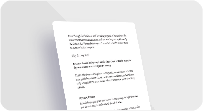 Even though the business and branding aspects of books drive the economic return on investment and are thus important, I honestly think that the “intangible impacts” are what actually matter most to authors in the long run. Why do I say that? Because books help people make their lives better in ways far beyond what’s measured just by money. That’s why I wrote this piece: to help authors understand what the intangible benefits of a book can be, and to understand that it’s not only acceptable to want them—they’re often the point of writing a book. PERSONAL GROWTH A book helps you grow as a person in many ways, though these are not always easy to understand ahead of time: 1. Identity Change and Level Up: Before you write a book, you’re just a regular person like anyone else. But after you write and publish your book, you have a new identity: you’re an author. That’s a big deal. Being an author means you’re someone who has valuable ideas that can help people, and it means you took the time to sit down and write them out and get them published, and it means you shared them with the world. It means you’ve stepped into the arena. You’ve made your ideas real, in a format that allows others to assess, analyze, and debate them—and that opens YOU up to the next level of learning and expansion. In essence, it can be confirmation that the work you do matters to other people. This shift in identity moves you up a level in life. You are now in a 400 · ThE SCriBE METhOD