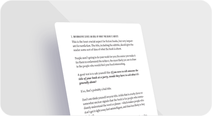 3. INFORMATIVE (GIVES AN IDEA OF WHAT THE BOOK IS ABOUT) This is the least crucial aspect for fiction books, but very import- ant for nonfiction. The title, including the subtitle, should give the reader some sort of idea of what the book is about. People aren’t going to do your work for you; the easier you make it for them to understand the subject, the more likely you are to draw in the people who would find your book interesting. A good test is to ask yourself this: If you were to tell someone the title of your book at a party, would they have to ask what it’s generally about? If so, that’s probably a bad title. Don’t out-think yourself on your title. A title that is overly clever or somewhat unclear signals that the book is for people who imme- diately understand the word or phrase—which makes people who don’t get it right away feel unintelligent, and thus less likely to buy the book. By using a word or phrase that is either not immediately under- standable by your desired audience or doesn’t convey the point of the book, you are putting a huge obstacle in front of your success. Though your book title should be informative and easily under- stood, it does not need to spell out the whole book idea. Take Malcolm Gladwell’s Outliers for example: this title does a great job of cuing the content of the book without describing it outright. 4. EASY AND NOT EMBARRASSING TO SAY Having an easy-to-say title is a concept called cognitive fluency and to make it simple, it means that people are more likely to remember and respond favorably to words and phrases they can immediately understand and pronounce. We don’t want to go too far into the PiCkiNg ThE PErfECT BOOk TiTlE · 187