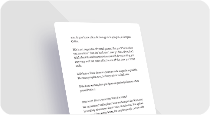 a.m., in your home office. Or from 3 p.m. to 4:30 p.m., at Compass Coffee. This is not negotiable. If you tell yourself that you’ll “write when you have time” then the book won’t ever get done. If you don’t think about the environment where you will do your writing, you may very well not make effective use of that time you’ve set aside. With both of these elements, you want to be as specific as possible. The more you plan now, the less you have to think later. If the book matters, then you figure out precisely when and where you will write it. How Much Time Should You Write Each Day? We recommend writing for at least one hour per day. If you only have thirty minutes per day to write, then do that. The optimal amount of time is two hours, but very few people can set aside that much time. Also, be realistic. Most authors cannot write (effectively) for more than three hours a day. What Time of Day Should You Write? The data is very clear: most people are the most creative about an hour after they wake up, until about four hours after they wake up. That means you’re probably most creative in the morning. But outliers DO exist, and so do night owls. If you are one of those, honor it. All that matters is consistency and action. Make writing a routine that works for you, and you’ll do it. hOW TO CrEATE yOUr BOOk WriTiNg PlAN · 127