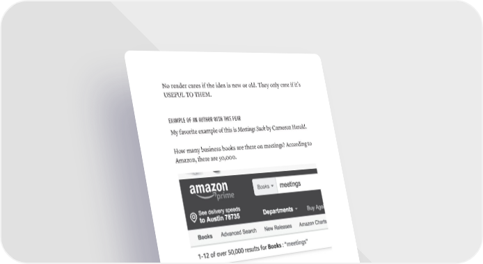 No reader cares if the idea is new or old. They only care if it’s USEFUL TO THEM. EXAMPLE OF AN AUTHOR WITH THIS FEAR My favorite example of this is Meetings Suck by Cameron Herold. How many business books are there on meetings? According to Amazon, there are 50,000. Surely if there was one book that did not need to be written, it was this one, right? That’s what Cameron thought at first. We walked through what he knew, and helped him realize that though his methodology for meetings had no single insight that was truly original, the way that he combined all his insights and presented a complete plan for how to run a meeting was deeply useful to everyone he coached and taught. With 105 reviews and 45,000 copies sold, it’s obvious that his take is engaging with people in a way that none of the other books on meetings have. ThE Six fEArS yOU (COUlD) fACE WriTiNg yOUr BOOk · 29