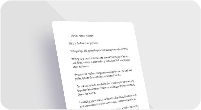 • The One Minute Manager What is the lesson for you here? Telling simple and compelling stories to convey your point WORKS. Writing for a smart, interested 12-year-old forces you to be clear and direct—which in turn makes your book MORE appealing to older audiences. If you do that—without being condescending in tone—the book will probably be as clear and direct as you need it to be. I’m not saying to be simplistic. I’m not saying to leave out any important information. I’m not even telling you to dumb anything down—far from it. I am telling you to write your ideas in a digestible, direct way such that a smart and interested 12-year-old could understand them. To be clear, that doesn’t mean your ideas themselves have to be simple; it just means your presentation of them is simple and direct. The problem is that so many people think good writing is compli- cated and difficult to read. That is not true. There are some fields, like academia, where writing in a needlessly complex way is given high status. But outside of those fields, the more direct and simple the writing is, the more accessible your actual ideas will be, and the better the book will do with readers—which is how you get everything you want as well. THE THREE-STEP EDITING METHOD We recommend a three-step editing process: 164 · ThE SCriBE METhOD