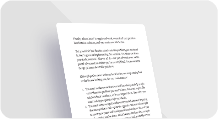 Finally, after a lot of struggle and work, you solved your problem. You found a solution, and you made your life better. But you didn’t just find the solution to this problem, you mastered it. You’re great at implementing this solution. Yes, there are times you doubt yourself—like we all do—but part of you is even a little proud of yourself and what you’ve accomplished. You know some things (at least about this problem). Although you’ve never written a book before, you keep coming back to the idea of writing one, for two main reasons: 1. You want to share your hard-earned knowledge to help people solve the same problem you used to have. You want to give this wisdom back to others, so it can impact them. Basically, you want to help people through your book. 2. You want some recognition for what you did. I am not implying that recognition is bad—quite the opposite. It is natural and right to want your peers and family and friends to know the real you and see what you’ve done. And it’s normal to hope this recogni- tion will actually help you in some way as well, probably in your career (and maybe even in your personal life, too). I’d bet you’ve been thinking about writing a book for a while. You’ve probably had people saying, “you should write a book” to you long before now. But you didn’t acknowledge it, because the next step—writing the book—was too scary. After all, you don’t know where to start, or how to structure your book, or if your book idea is good enough, or if you have enough to say, or if anyone will care once you write it. And there’s the worst fear of all, the one you don’t want to talk about, but always lingers. 10 · ThE SCriBE METhOD