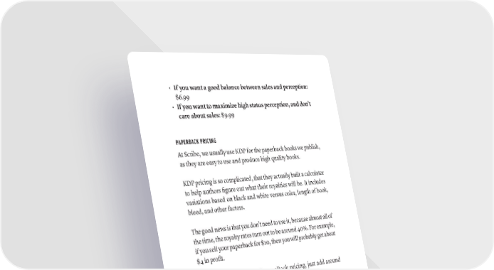 • If you want a good balance between sales and perception: $6.99 • If you want to maximize high status perception, and don’t care about sales: $9.99 PAPERBACK PRICING At Scribe, we usually use KDP for the paperback books we publish, as they are easy to use and produce high quality books. KDP pricing is so complicated, that they actually built a calculator to help authors figure out what their royalties will be. It includes variations based on black and white versus color, length of book, bleed, and other factors. The good news is that you don’t need to use it, because almost all of the time, the royalty rates turn out to be around 40%. For example, if you sell your paperback for $10, then you will probably get about $4 in profit. Paperback pricing is similar to eBook pricing, just add around $7-$10 to every price. So the chart would look like this: PAPERBACKS High Price $17.99-$19.99 Normal $14.99-$16.99 Cheap $11.99-$13.99 Dirt Cheap $7.99-$10.99 This rule of thumb has worked very well for our authors in pricing: whatever the eBook price is, add about $7-$10 for the paperback price. 308 · ThE SCriBE METhOD