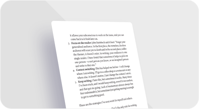 it allows your subconscious to work on the issue, and you can come back to it fresh later on. 3. Focus on the reader: John Steinbeck said it best: “Forget your generalized audience. In the first place, the nameless, faceless audience will scare you to death and in the second place, unlike the theater, it doesn’t exist. In writing, your audience is one single reader. I have found that sometimes it helps to pick out one person — a real person you know, or an imagined person and write to that one.” 4. Context switching: This has helped me before—I will change where I am writing. I’ll go to a coffee shop or a restaurant or any- where else. It doesn’t matter, I just change the context I am in. 5. Keep writing: I hate this, but sometimes it works. Many times I’ve been stuck, and I would keep writing, even if it was useless, and that got me going. Lack of momentum almost always has fear underneath it, but sometimes just getting moving is enough to get to something good. These are the strategies I’ve seen work for myself and others. But again, do what works for you. That’s the only rule for writing. hOW DO yOU BEAT WriTEr’S BlOCk? · 435