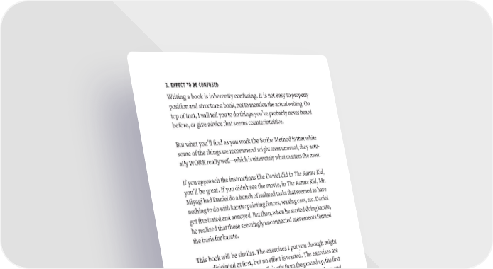 3. EXPECT TO BE CONFUSED Writing a book is inherently confusing. It is not easy to properly position and structure a book, not to mention the actual writing. On top of that, I will tell you to do things you’ve probably never heard before, or give advice that seems counterintuitive. But what you’ll find as you work the Scribe Method is that while some of the things we recommend might seem unusual, they actu- ally WORK really well—which is ultimately what matters the most. If you approach the instructions like Daniel did in The Karate Kid, you’ll be great. If you didn’t see the movie, in The Karate Kid, Mr. Miyagi had Daniel do a bunch of isolated tasks that seemed to have nothing to do with karate: painting fences, waxing cars, etc. Daniel got frustrated and annoyed. But then, when he started doing karate, he realized that those seemingly unconnected movements formed the basis for karate. This book will be similar. The exercises I put you through might seem disjointed at first, but no effort is wasted. The exercises are designed to build your book efficiently from the ground up, the first time—as long as you have the discipline to walk through them and do them right, it’ll work. 4. EXPECT TO FEEL OVERWHELMED AT TIMES There is a lot coming. It will be like drinking from a firehose. You WILL feel overwhelmed at times. But understand this: overwhelm is NOT KNOWING WHAT TO DO NEXT—which is exactly why you are reading this book. We solve this for you. If you follow along and do what we say, you will ALWAYS know what to do next. We’ve made this process so that there are no surprises. ThE PrOPEr ExPECTATiONS fOr WriTiNg yOUr BOOk · 23