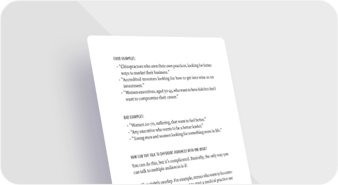 GOOD EXAMPLES: • “Chiropractors who own their own practices, looking for better ways to market their business.” • “Accredited investors looking for how to get into wine as an investment.” • “Women executives, aged 30-45, who want to have kids but don’t want to compromise their career.” BAD EXAMPLES: • “Women 20-70, suffering, that want to feel better.” • “Any executive who wants to be a better leader.” • “Young men and women looking for something more in life.” HOW CAN YOU TALK TO DIFFERENT AUDIENCES WITH ONE BOOK? You can do this, but it’s complicated. Basically, the only way you can talk to multiple audiences is if: • They tightly overlap. For example, nurses who want to be entre- preneurs and nurses who want to start a medical practice are different audiences, but they overlap very much. • They have the same concern or problem you are solving. For example, people with sleep problems and people with energy issues are different audiences, but if they are both caused by the same thing (a thyroid issue, for example), then they are very different audiences who have the same problem. You can have a few different sets of primary audiences, just make sure if you do, they connect in a very obvious way. AUDIENCE QUESTION #2: DESCRIBE A TYPICAL PERSON IN YOUR PRIMARY AUDIENCE (AN AVATAR). WHAT ARE THEY LIKE? This person is literally who you’re writing the book for. They are your perfect reader. figUrE OUT yOUr AUDiENCE · 73