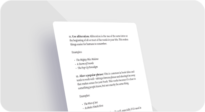 11. Use alliteration: Alliteration is the use of the same letter at the beginning of all or most of the words in your title. This makes things easier for humans to remember. Examples: • The Mighty Miss Malone • A Storm of Swords • The Pop-Up Paradigm 12. Alter a popular phrase: This is common in book titles and tends to work well—taking a famous phrase and altering it in a way that makes sense for your book. This works because it’s close to something people know, but not exactly the same thing. Examples: • The War of Art • Assholes Finish First 13. Use slang: Slang can work really well, especially if it’s used in a way that is nonintuitive but also novel. Examples: • Ain’t Too Proud to Beg • No Mopes Allowed: A Small Town Police Chief Rants and Babbles about Hugs and High Fives, Meth Busts, Internet Celebrity, and Other Adventures 14. Try cliché formats (or reversing them): There are a ton of book-naming tropes that can work well if used correctly: • The Art of [TOPIC] • The Myth of [TOPIC] • Confessions of [TOPIC] PiCkiNg ThE PErfECT BOOk TiTlE · 195