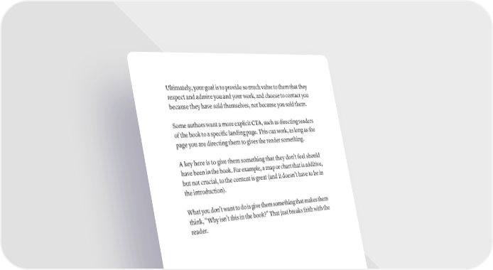 Ultimately, your goal is to provide so much value to them that they respect and admire you and your work, and choose to contact you because they have sold themselves, not because you sold them. Some authors want a more explicit CTA, such as directing readers of the book to a specific landing page. This can work, as long as the page you are directing them to gives the reader something. A key here is to give them something that they don’t feel should have been in the book. For example, a map or chart that is additive, but not crucial, to the content is great (and it doesn’t have to be in the introduction). What you don’t want to do is give them something that makes them think, “Why isn’t this in the book?” That just breaks faith with the reader. OUTliNE ThE CONClUSiON · 121