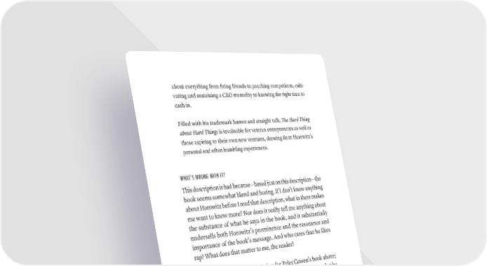 about everything from firing friends to poaching competitors, culti- vating and sustaining a CEO mentality to knowing the right time to cash in. Filled with his trademark humor and straight talk, The Hard Thing about Hard Things is invaluable for veteran entrepreneurs as well as those aspiring to their own new ventures, drawing from Horowitz’s personal and often humbling experiences. WHAT’S WRONG WITH IT? This description is bad because—based just on this description—the book seems somewhat bland and boring. If I don’t know anything about Horowitz before I read that description, what in there makes me want to know more? Nor does it really tell me anything about the substance of what he says in the book, and it substantially undersells both Horowitz’s prominence and the resonance and importance of the book’s message. And who cares that he likes rap? What does that matter to me, the reader? Compare this with the description for Tyler Cowen’s book above; it explains who Cowen is and why I should care, it tells me what he says, applies the book to my life, and shows me exactly why I need to care about what he wrote. The irony is that having read both books, I can tell you that Horowitz’s is just as good, if not better than Cowen’s. But you would never know this from comparing the descriptions. DOUGLAS RUSHKOFF’S COERCION: WHY WE LISTEN TO WHAT “THEY” SAY Noted media pundit and author of Playing the Future Douglas Rush- koff gives a devastating critique of the influence techniques behind our culture of rampant consumerism. With a skilled analysis of how experts in the fields of marketing, advertising, retail atmospherics, and hand-selling attempt to take away our ability to make rational hOW TO WriTE A BOOk DESCriPTiON ThAT SEllS · 249