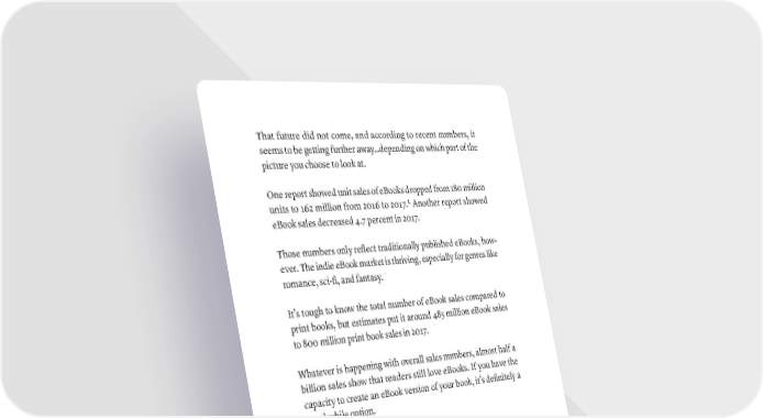 That future did not come, and according to recent numbers, it seems to be getting further away…depending on which part of the picture you choose to look at. One report showed unit sales of eBooks dropped from 180 million units to 162 million from 2016 to 2017.1 Another report showed eBook sales decreased 4.7 percent in 2017. Those numbers only reflect traditionally published eBooks, how- ever. The indie eBook market is thriving, especially for genres like romance, sci-fi, and fantasy. It’s tough to know the total number of eBook sales compared to print books, but estimates put it around 485 million eBook sales to 800 million print book sales in 2017. Whatever is happening with overall sales numbers, almost half a billion sales show that readers still love eBooks. If you have the capacity to create an eBook version of your book, it’s definitely a worthwhile option. TL;DR: Yes, do an eBook. EBOOK DISTRIBUTION FACTORS Amazon makes up 83 percent of eBook sales in the US, so it’s a must for authors looking to distribute their eBook.2 The only question is whether you should distribute solely on Amazon. For the US market, 17 percent of 485 million eBook sales is nothing 1 “E-Book Sales Fell 10% in 2017.” PublishersWeekly.com. Accessed September 17, 2019. https://www. publishersweekly.com/pw/by-topic/digital/content-and-e-books/article/76706-e-book-sales-fell-10-in-2017. html. 2 Jentetics, Kinga. “Amazon’s Ebook Market Share - Is It Big Enough?” PublishDrive, February 20, 2019. https:// publishdrive.com/amazon-ebook-market-share/. 342 · ThE SCriBE METhOD