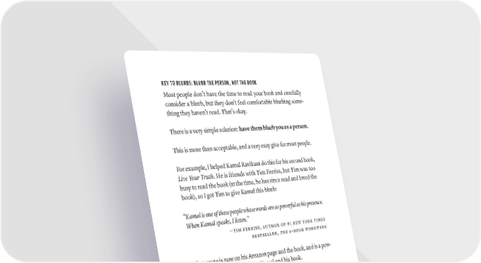 KEY TO BLURBS: BLURB THE PERSON, NOT THE BOOK Most people don’t have the time to read your book and carefully consider a blurb, but they don’t feel comfortable blurbing some- thing they haven’t read. That’s okay. There is a very simple solution: have them blurb you as a person. This is more than acceptable, and a very easy give for most people. For example, I helped Kamal Ravikant do this for his second book, Live Your Truth. He is friends with Tim Ferriss, but Tim was too busy to read the book (at the time, he has since read and loved the book), so I got Tim to give Kamal this blurb: “Kamal is one of those people whose words are as powerful as his presence. When Kamal speaks, I listen.” —tiM ferriSS, author of #1 New York Times beStSeller, THe 4-Hour workweek That quote is now on his Amazon page and the book, and is a pow- erful piece of social proof for Kamal and his book. ANOTHER BLURB TRICK Speaking of Tim, he uses a great trick to get blurbs, and I helped him do this on two books. While the book is still in process, he would print the most relevant chapter to the person he was asking for the blurb, personally high- light relevant sections and passages (with a highlighter and pen) and mail THAT to the person, with the offer of sending the whole book if they want. That’s a smart, strategic, and generous move, and it worked almost every time. 230 · ThE SCriBE METhOD