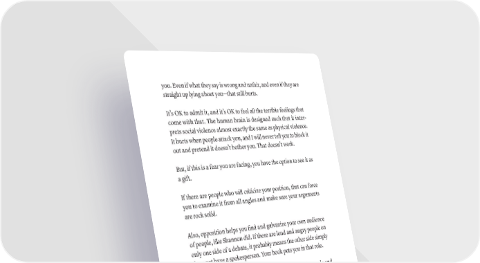 you. Even if what they say is wrong and unfair, and even if they are straight up lying about you—that still hurts. It’s OK to admit it, and it’s OK to feel all the terrible feelings that come with that. The human brain is designed such that it inter- prets social violence almost exactly the same as physical violence. It hurts when people attack you, and I will never tell you to block it out and pretend it doesn’t bother you. That doesn’t work. But, if this is a fear you are facing, you have the option to see it as a gift. If there are people who will criticize your position, that can force you to examine it from all angles and make sure your arguments are rock solid. Also, opposition helps you find and galvanize your own audience of people, like Shannon did. If there are loud and angry people on only one side of a debate, it probably means the other side simply does not have a spokesperson. Your book puts you in that role. Also, use this fear to make sure you are being fair to people and other arguments. It’s okay to be conscious about the words you use and how they impact people. This does not mean you water down your position—in fact, your argument is strengthened when it is considerate of alternate viewpoints. Finally, remember the iconic quote about this by Steven Pressfield: Making a judgment, taking a stand and then acting against an injustice or acting to support excellence is the stuff of the everyman hero. If you are an aspiring artist and you wish to avoid “judgments,” you’ll find that you have nothing to say. 36 · ThE SCriBE METhOD
