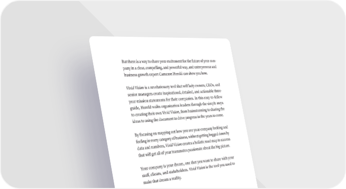 But there is a way to share your excitement for the future of your com- pany in a clear, compelling, and powerful way, and entrepreneur and business growth expert Cameron Herold can show you how. Vivid Vision is a revolutionary tool that will help owners, CEOs, and senior managers create inspirational, detailed, and actionable three- year mission statements for their companies. In this easy-to-follow guide, Herold walks organization leaders through the simple steps to creating their own Vivid Vision, from brainstorming to sharing the ideas to using the document to drive progress in the years to come. By focusing on mapping out how you see your company looking and feeling in every category of business, without getting bogged down by data and numbers, Vivid Vision creates a holistic road map to success that will get all of your teammates passionate about the big picture. Your company is your dream, one that you want to share with your staff, clients, and stakeholders. Vivid Vision is the tool you need to make that dream a reality. What Makes It Good? Three things make this good: 1. Engaging hook: Everyone knows that mission statements are BS, but how many people say this out loud? By doing so, it takes a stand and engages the potential reader immediately. 2. Important keywords: We tend to advocate staying away from buzzwords in your book description, but in some cases—espe- cially business books—the right use of them can work. This is an example of where they work. Words and phrases like “easy to follow” and “simple steps” and “drive progress” actually work. 3. Clear pain and benefit: This book is not appealing to every- one—but to the perfect reader, it’s very appealing because it clearly articulates a real problem (“slick, flashy mission state- ments that ultimately do little”) and then tells you the result it hOW TO WriTE A BOOk DESCriPTiON ThAT SEllS · 245