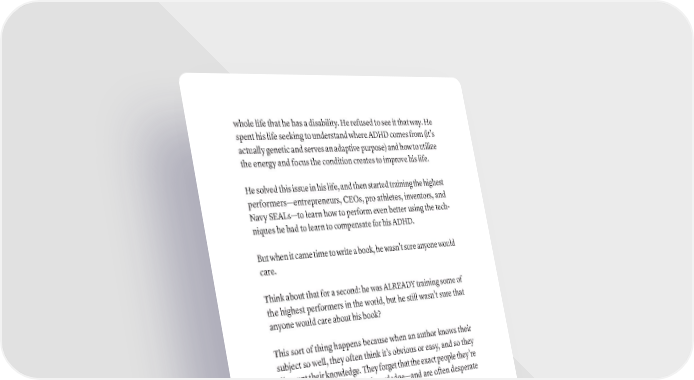 whole life that he has a disability. He refused to see it that way. He spent his life seeking to understand where ADHD comes from (it’s actually genetic and serves an adaptive purpose) and how to utilize the energy and focus the condition creates to improve his life. He solved this issue in his life, and then started training the highest performers—entrepreneurs, CEOs, pro athletes, inventors, and Navy SEALs—to learn how to perform even better using the tech- niques he had to learn to compensate for his ADHD. But when it came time to write a book, he wasn’t sure anyone would care. Think about that for a second: he was ALREADY training some of the highest performers in the world, but he still wasn’t sure that anyone would care about his book? This sort of thing happens because when an author knows their subject so well, they often think it’s obvious or easy, and so they discount their knowledge. They forget that the exact people they’re writing for do not have this knowledge—and are often desperate for it. In Dr. Brackmann’s case, this happened. Look at the Amazon Reviews: The tools that Dr. Brackmann gave me, all of which you will find in his book, allowed me to find inner peace and happiness and realize my true potential…I could recognize my soul again, lift myself up and design the life I had always dreamed of. Dr. Brackmann helped me understand how my mind worked and helped me harness the Driven characteristics I had so that in less than 1 year I could build a 7 figure business with no outside help, find the girl of my dreams, and pursue a life of mastery in many different areas. I highly recommend this book for anyone that has a desire to find more peace while fulfilling their potential. ThE Six fEArS yOU (COUlD) fACE WriTiNg yOUr BOOk · 33