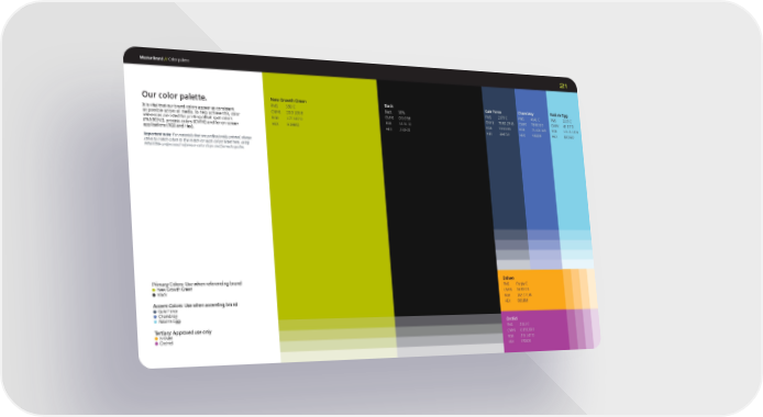 Master Brand // 21 Primary Colors: Use when referencing brand New Growth Green Black Accent Colors: Use when accenting brand Gale Force Chambray Robin's Egg Tertiary: Approved use only Enliven Orchid Gale Force PMS 2379 C CMYK 78 60 29 45 RGB 59 69 89 HEX 3B4559 Enliven PMS Purple C CMYK 36 89 0 0 RGB 182 27 184 HEX B61BB8 Chambray PMS 4141 C CMYK 78 60 0 0 RGB 73 100 169 HEX 43609F Robin’s Egg PMS 2225 C CMYK 45 0 7 0 RGB 111 211 224 HEX 6FD3E0 Orchid PMS 2013 C CMYK 0 39 100 0 RGB 255 147 0 HEX FF9300 Black Black 98% CMYK 0 0 0 98 RGB 35 31 32 HEX 231F20 New Growth Green PMS 390 C CMYK 20 0 100 8 RGB 177 187 0 HEX B1BB00 Our color palette. It is vital that our brand colors appear as consistent as possible across all media. To help achieve this, color references are listed for printing offset spot colors ( PANTONE ) , process colors ( CMYK ) and for on-screen applications ( RGB and Hex ) . Important note: For materials that are professionally printed, always strive to match colors to the match (or spot) colors listed here, using PANTONE professional reference color chips and formula guides. Color palette