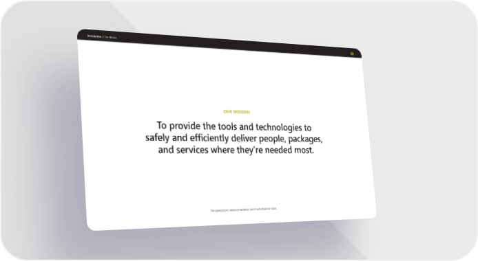 Introduction // 6 To provide the tools and technologies to safely and efficiently deliver people, packages, and services where they’re needed most. OUR MISSION Our Mission The organization ’ s reason for existence. How it will achieve its vision.