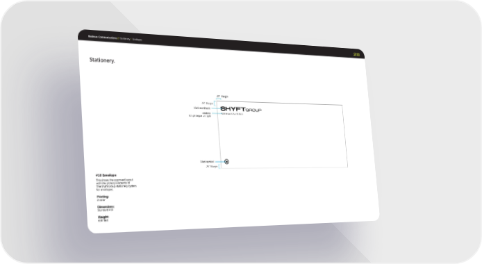Business Communications // 28 #10 Envelope This shows the approved layout with the primary elements of The Shyft Group stationery system for envelopes. Printing: 2 color Dimensions: Standard #10 Weight: 65# Text 41280 Bridge St, Novi, MI 48375 Stationery. Black wordmark .25" Margin .25" Margin .25" Margin Black symbol Address 8.5 pt Segoe UI Light Stationery / Envelopes