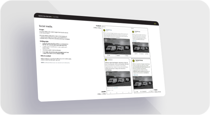 Digital & Video Style Guide // 41 Social media. Images For social media posts, select images that show the vehicle as the hero or focus. Be sure to select photos with an eye on the background — avoid using images that show an environment that is cluttered, dirty, or may show proprietary tooling or processes. Writing style • Facebook posts should be written in a conversational manner with more storytelling and less reporting. • LinkedIn posts should feature a more professional tone of voice. • Avoid exclamation marks and emojis. • In all cases, be sure the posts are engaging and have a clear call to action ( link to relevant page ). Who to contact Before posting on one of The Shyft Group social media pages, please contact Marketing for approval. NOTE: See Human Resources for our corporate social media policy. Facebook 1,200px x 628px LinkedIn 1200px x 1200px Twitter 1024px x 512px Social Media