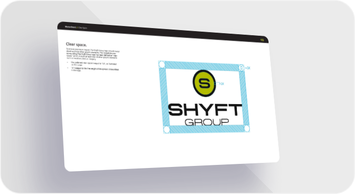 Master Brand // 15 Clear space. To ensure maximum impact, The Shyft Group logo should always stand out from other graphic elements. The immediate area surrounding The Shyft Group logo has been defined as “ clear space, ” which should be kept clear of other graphic elements such as headlines, text, or imagery. • The preferred clear space is equal to “ 3X ” , as illustrated on this page. • “ X ” is equal to the line weight of the symbol circle artifact in the logo. =1X Clear Space =3X