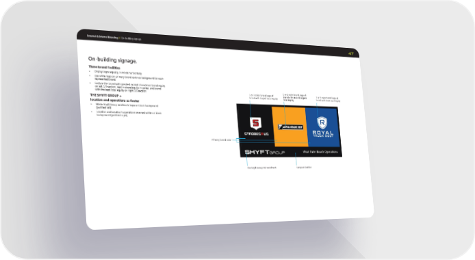 External & Internal Branding // 47 On-building signage. Three brand Facilities • Display logos equally, in thirds horizontally • Use white logo on primary brand color as background for each represented brand • Feature the brand with greatest market share/local brand equity on left 1/3 section, next in share/equity in center, and brand with the least local equity on right 1/3 section THE SHYFT GROUP + location and operations as footer • White Shyft Group wordmark logo on black background ( justified left ) • Location and location ’ s operations reversed white on black background ( justified right ) Campus location The Shyft Group KO wordmark 1 or 2 color brand logo of brand with largest local equity 1 or 2 color brand logo of brand with second largest local equity 1 or 2 color brand logo of brand with least local equity Primary brand color On-building signage