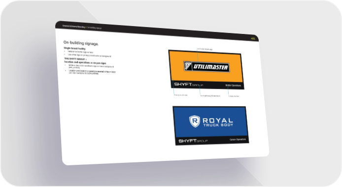 External & Internal Branding // 45 On-building signage. Single brand Facility • Feature horizontal logo as hero • Use white logo on primary brand color as background THE SHYFT GROUP + location and operations as on pan signs • White or two-color wordmark logo on black background ( left-justified ) • Location and location ’ s operations reversed white on black pan sign background ( right-justified ) Primary brand color Campus location The Shyft Group KO wordmark 1 or 2 color Brand Logo On building signage