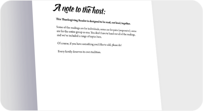A note to the host: 吀栀is 吀栀anksgiving Reader is designed to be read, out loud, together. Some of the readings are for individuals, some are for pairs (responsive), some are for the entire group as one. You don’t have to hand out all of the readings, and we’ve included a range of topics here. Of course, if you have something you’d like to add, please do! Every family deserves its own tradition. •