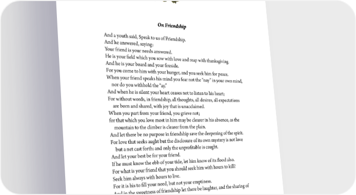 On Friendship And a youth said, Speak to us of Friendship. And he answered, saying: Your friend is your needs answered. He is your 昀椀eld which you sow with love and reap with thanksgiving. And he is your board and your 昀椀reside. For you come to him with your hunger, and you seek him for peace. When your friend speaks his mind you fear not the “nay” in your own mind, nor do you withhold the “ay.” And when he is silent your heart ceases not to listen to his heart; For without words, in friendship, all thoughts, all desires, all expectations are born and shared, with joy that is unacclaimed. When you part from your friend, you grieve not; for that which you love most in him may be clearer in his absence, as the mountain to the climber is clearer from the plain. And let there be no purpose in friendship save the deepening of the spirit. For love that seeks aught but the disclosure of its own mystery is not love but a net cast forth: and only the unpro昀椀table is caught. And let your best be for your friend. If he must know the ebb of your tide, let him know of its 昀氀ood also. For what is your friend that you should seek him with hours to kill? Seek him always with hours to live. For it is his to 昀椀ll your need, but not your emptiness. And in the sweetness of friendship let there be laughter, and the sharing of pleasures. For in the dew of li琀琀le things the heart 昀椀nds its morning and is refreshed. • Kahlil Gibran, 昀爀om 吀栀e Prophet •