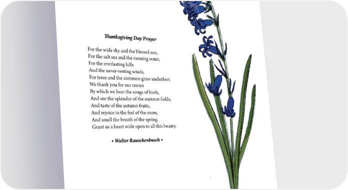 吀栀anksgiving Day Prayer For the wide sky and the blessed sun, For the salt sea and the running water, For the everlasting hills And the never-resting winds, For trees and the common grass underfoot. We thank you for our senses By which we hear the songs of birds, And see the splendor of the summer 昀椀elds, And taste of the autumn fruits, And rejoice in the feel of the snow, And smell the breath of the spring. Grant us a heart wide open to all this beauty. • Walter Rauschenbusch •