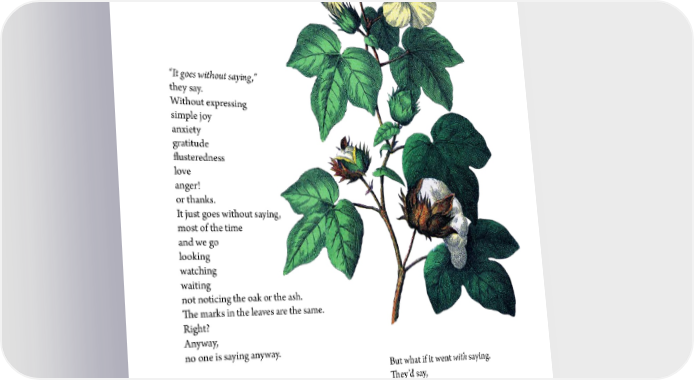 “It goes without saying,” they say. Without expressing simple joy anxiety gratitude 昀氀usteredness love anger! or thanks. It just goes without saying, most of the time and we go looking watching waiting not noticing the oak or the ash. 吀栀e marks in the leaves are the same. Right? Anyway, no one is saying anyway. But what if it went with saying. 吀栀ey’d say, “It goes with saying.” And we might say, thanks. • bobulate •